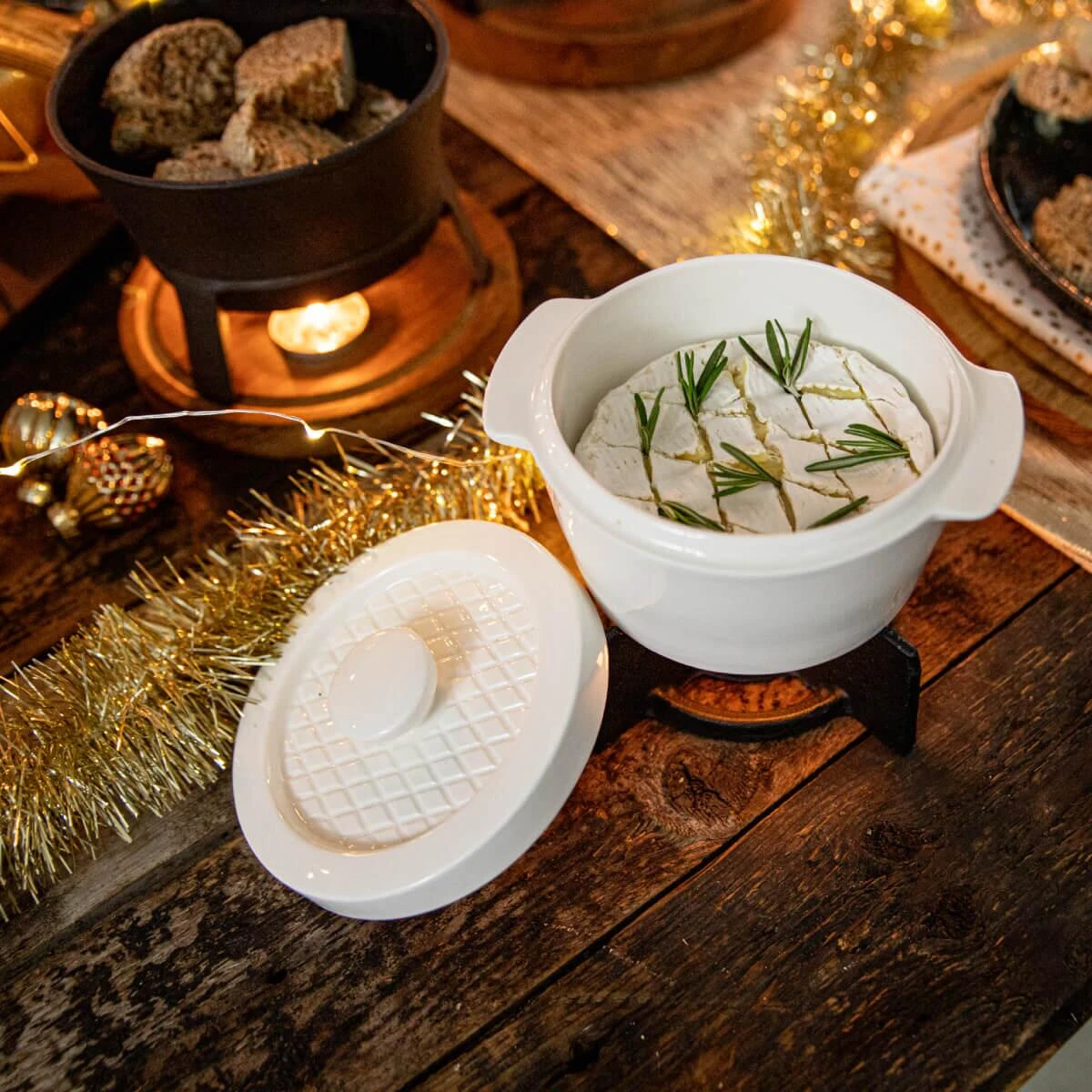Der kompakte Cheesbaker von Boska bietet ausreichend Platz für ein großes Stück Camembert oder Blauschimmelkäse. Der Deckel und das Teelicht im Untergestell sorgen dafür, dass die Hitze lange im Topf bleibt. Nach Belieben können zum Käse Nüsse, Datteln, Kräuter und Gewürze hinzugegeben werden.