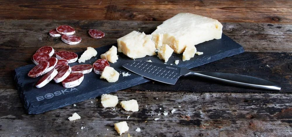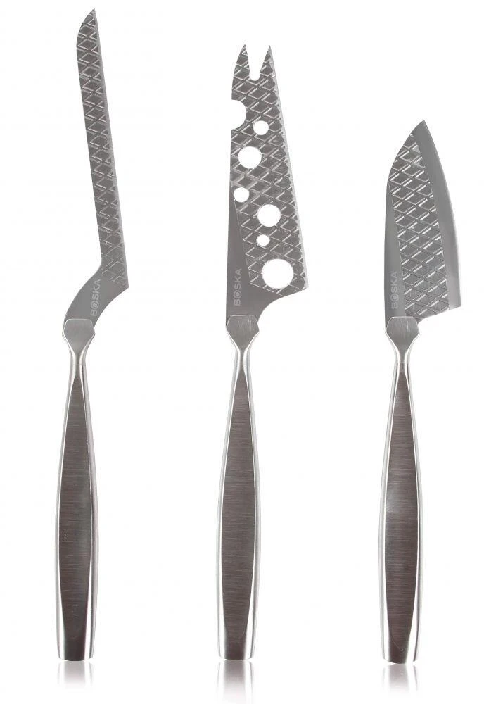 Boska Messerset Monaco+, 3-teilig. Inklusive je einem Käsemesser für Weichkäse, Parmesan und Brie. Mit Antihaftbeschichtung, damit sich der Käse besser löst.