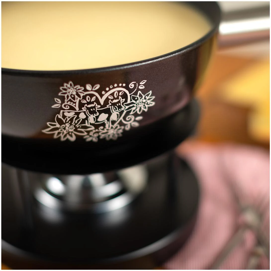 Das Caquelon aus Aluminium ist ein echtes Leichtgewicht und dadurch mühelos zu heben. Die Edelweiss-Blümchen und die Kuhapplikation umrandet von einem Herzbogen lassen Schweizer Herzen höher schlagen.