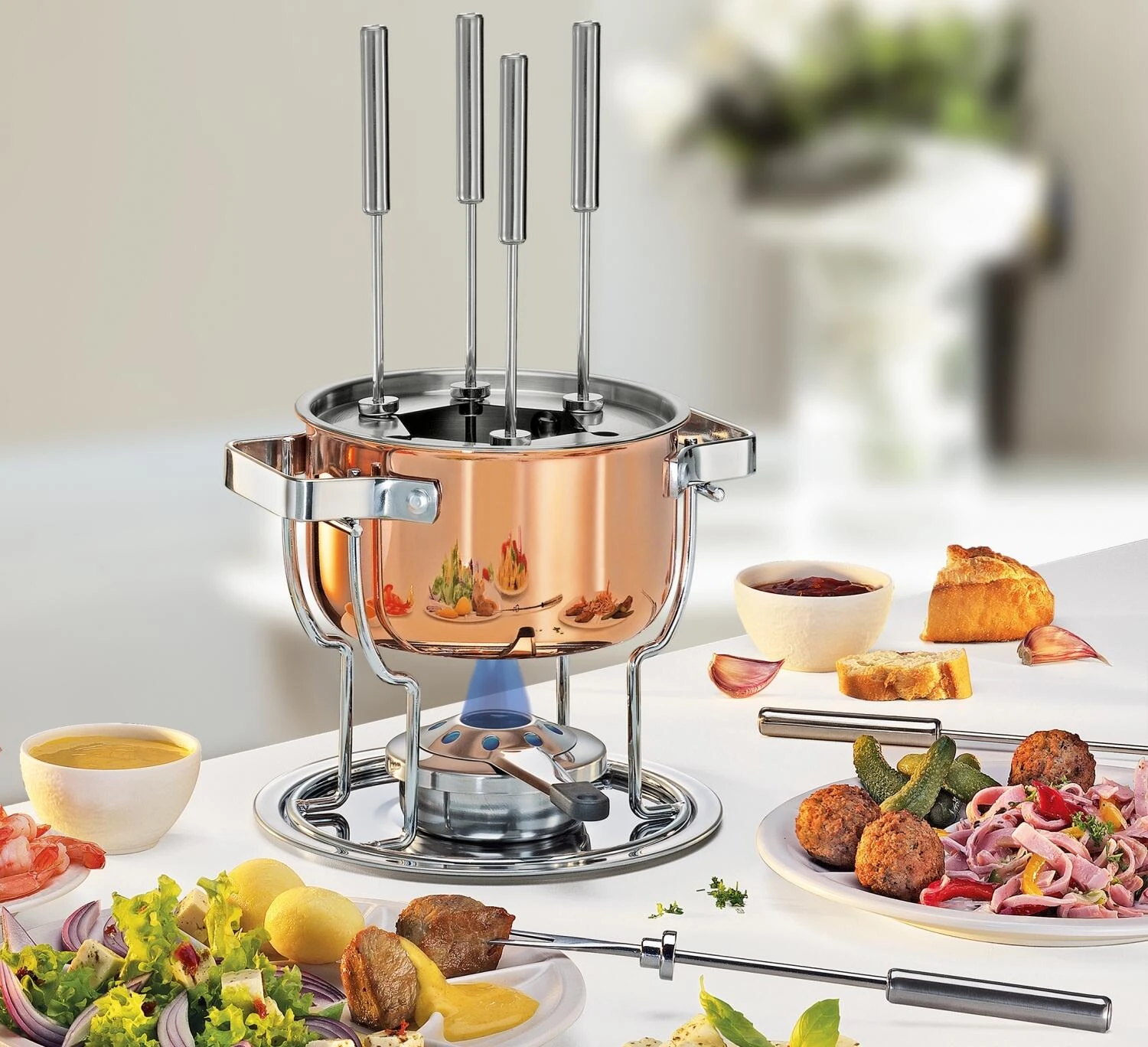 Fondue Set Davos Culinox. Ein Hingucker am Tisch: Verkupferter Topf aus Edelstahl mit 1,5 L Fassungsvermögen. Für alle Herdarten außer Induktion geeignet. Fonduegabeln mit Halterung zum Einhängen – verhindert ein Verhaken.