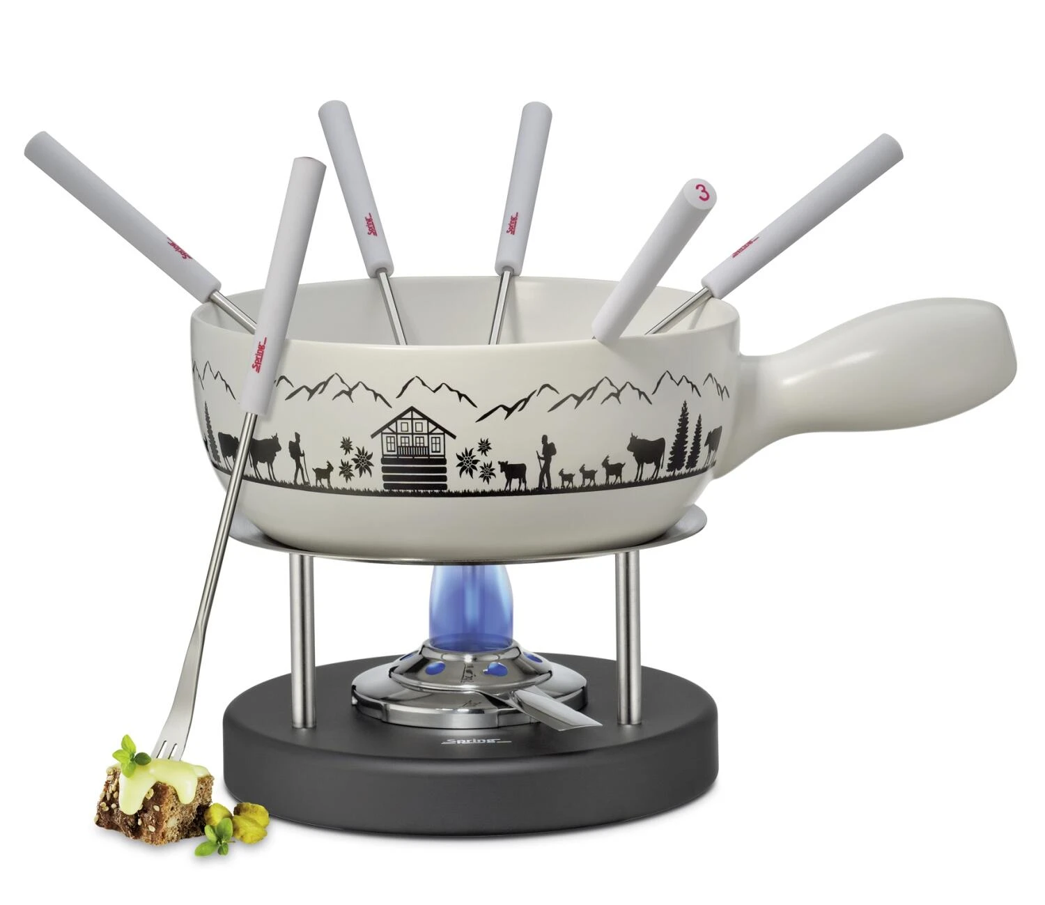 Spring Käsefondue-Set Montana. Käsefondue-Set mit idyllischem Alpenmotiv auf dem Caquelon.