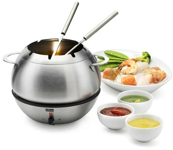 Stöckli Fonduegarnitur Hot Bowl. Die elektrische Fonduegarnitur bietet Fonduespaß für bis zu 6 Personen. Der Fonduetopf inklusive Spritzschutz besteht aus hochwertigem Edelstahl und ist besonders pflegefreundlich.