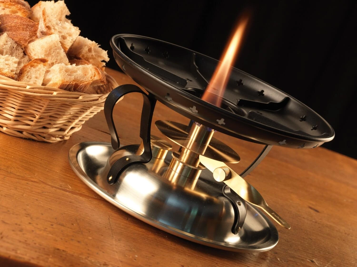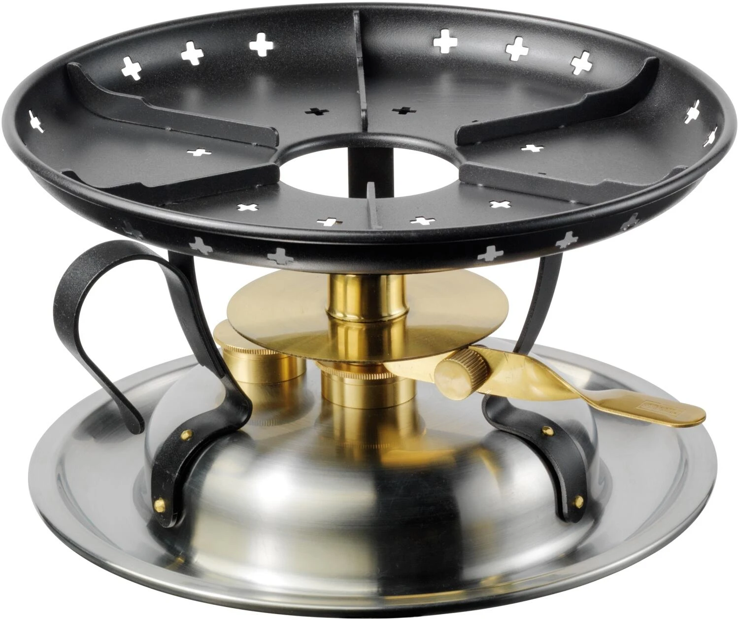 Der klassische Rechaud von Stöckli aus silbernem Inox verfügt über einen exakt einstellbaren Spritbrenner mit Docht, einen großen Spritmessbecher, eine Löschkappe mit Kette und praktischerweise auch über eine Tragegriff.
