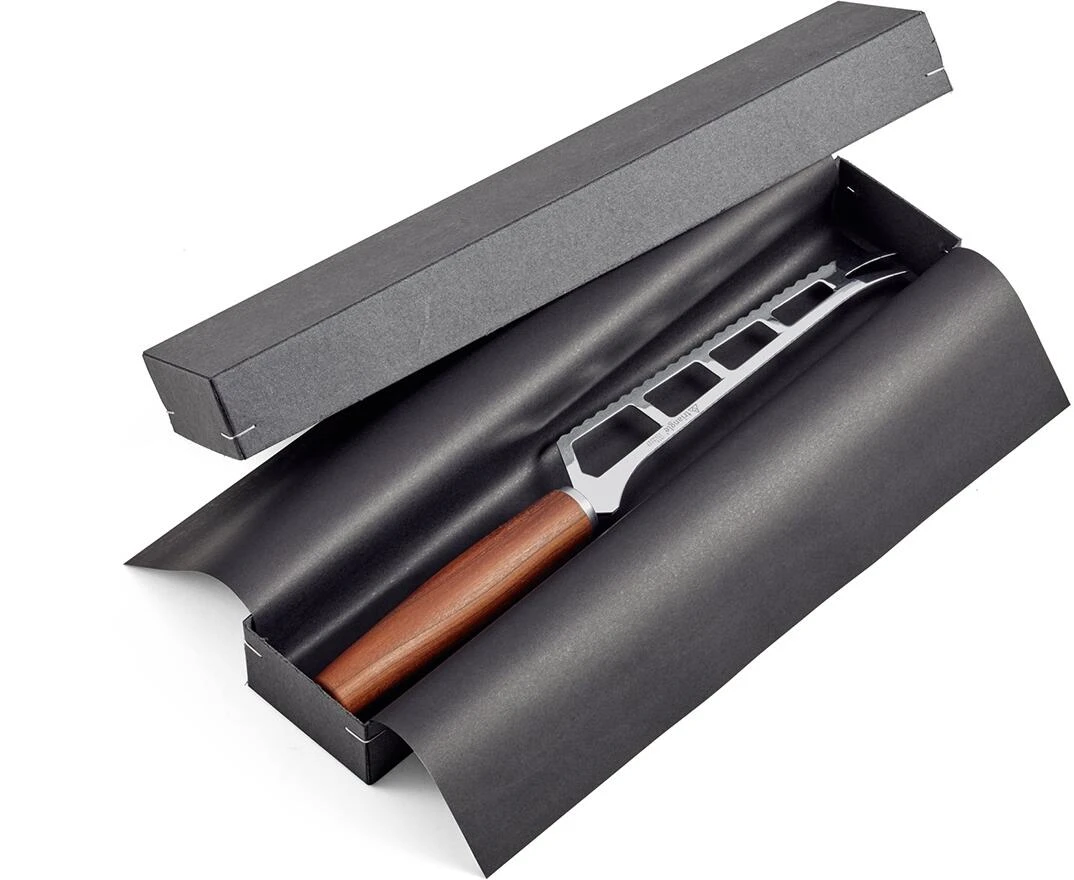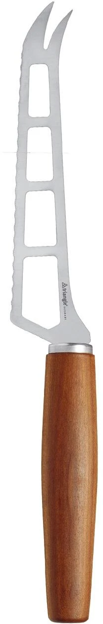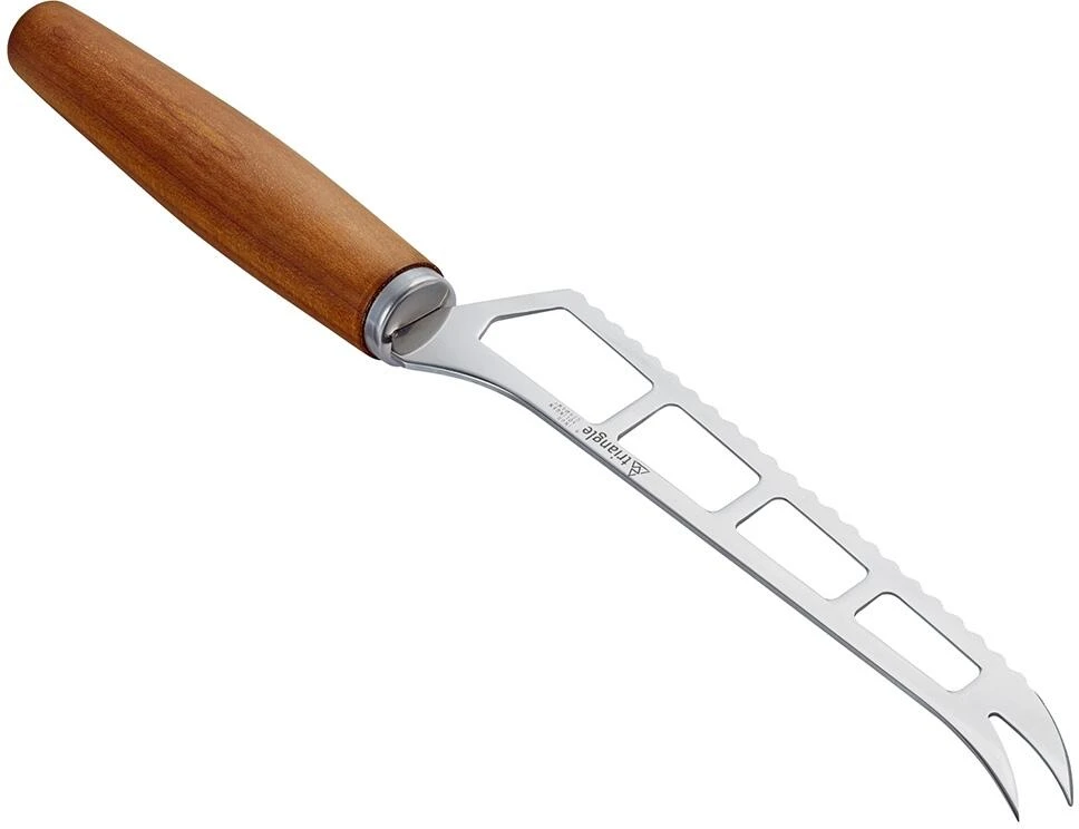 Unverzichtbar auf der Käseplatte. Das Käsemesser Sense mit durchbrochener Klinge bietet dem Käse wenig Oberfläche zum Anhaften und erleichtert dadurch den Schnitt. Mit 2-zinkiger Servierspitze. Für Sense verwendet triangle regionales, FSC-zertifiziertes Pflaumenholz und unterstützt damit eine nachhaltige Holzwirtschaft und kurze Transportwege. Die Griffe werden im Sauerland gedrechselt, anschließend in Solingen fein bearbeitet und mit Funktionsteilen aus Edelstahl konfektioniert. Gefertigt wird selbstverständlich mit Ökostrom. Hergestellt in Solingen.